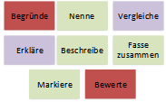 | Operatoren | beschreibennennenskizzierenzeichnenaufzählenausschneidenaufklebenankreuzenmessenabschreibenbeschriftenberechnen | charakterisierenordnenvergleichenzeichnenzusammenfassenübertragenRegeln anwendenableiten | bewertenbegründenbeurteilengestalteninterpretierenuntersuchendiskutierendeuten |
